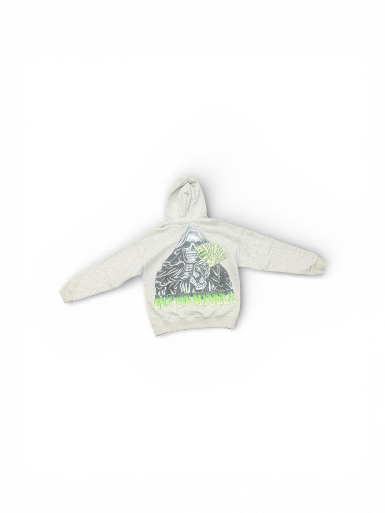 The SELFPAID “Bet On Myself” Hoodie in Heather Grey with Green accents. Our signature piece featuring the grim reaper graphic on the back, holding a fan of cash with “BET ON MYSELF” in bold green lettering. The front features a subtle embroidered SELFPAID logo on the left chest in green.