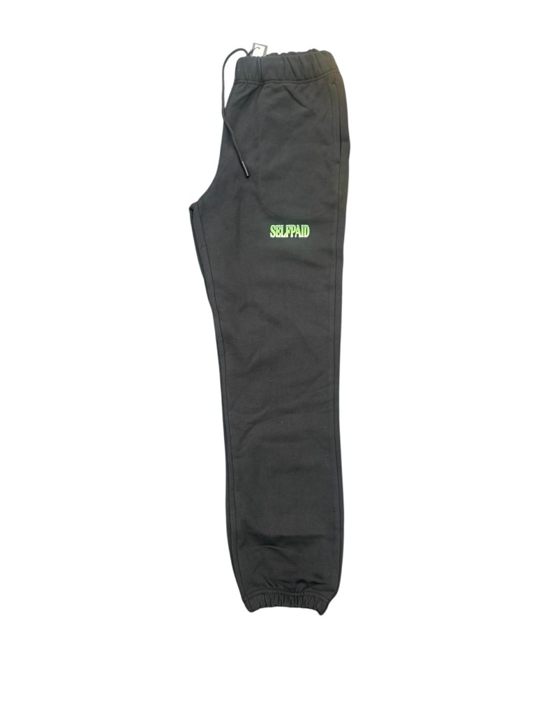 The SELFPAID Joggers in Black with Green logo. Premium heavyweight joggers featuring the SELFPAID logo on the left leg in bold green. Built with an elastic waistband, drawstring closure, and tapered cuffs for a clean silhouette.